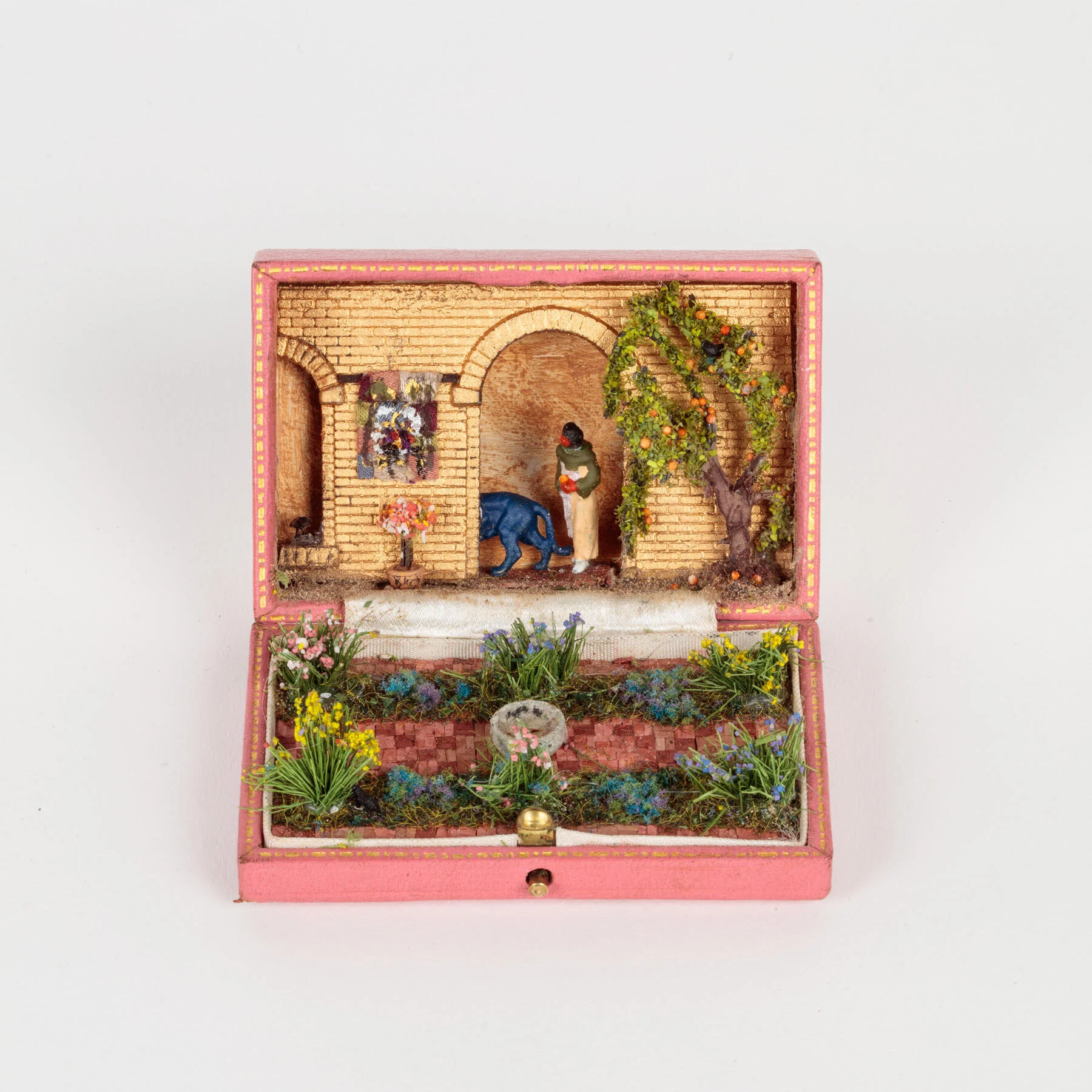 A moment of reflection and self care, 2018 mixed media diorama in reclaimed jewelry box 3 x 2 3/4 x 3 1/2 inches